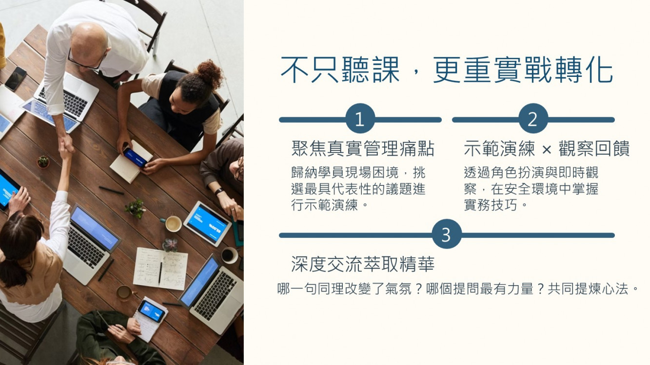 實體討論演練將會非常受用,直接針對公司議題處理。