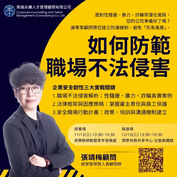 您是否擔心職場潛在威脅對企業形象與員工士氣的影響?面對性騷擾、暴力行為或詐騙,企業主更需具備應對策略來保護員工和公司利益。我們的講座將揭示職場不法侵害的真相,幫助您建立安全的工作環境! 顧問將深入分析各類職場不法行為的特徵,分享法律知識和實用的防範措施。透過真實案例與互動討論,您將學習到有效的危機管理策略,讓企業在面對挑戰時更具韌性。